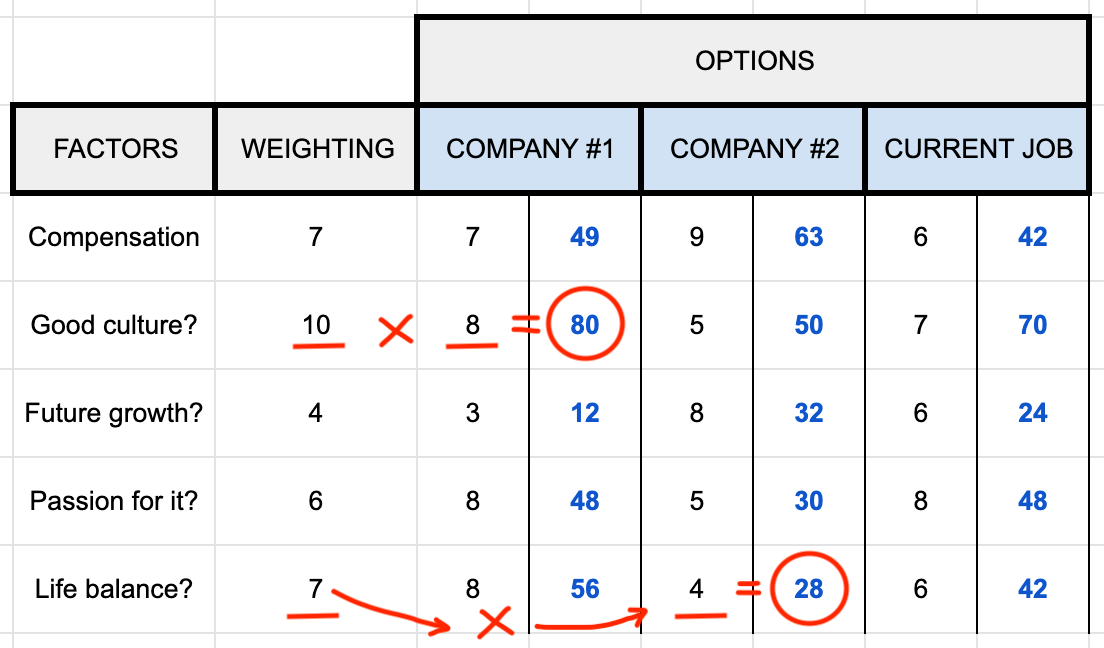 - Example: Considering a career move abroad, weigh factors such as career growth, family happiness, financial stability, and cultural experience. Assign numerical weights, score each, and clearly identify your best option.